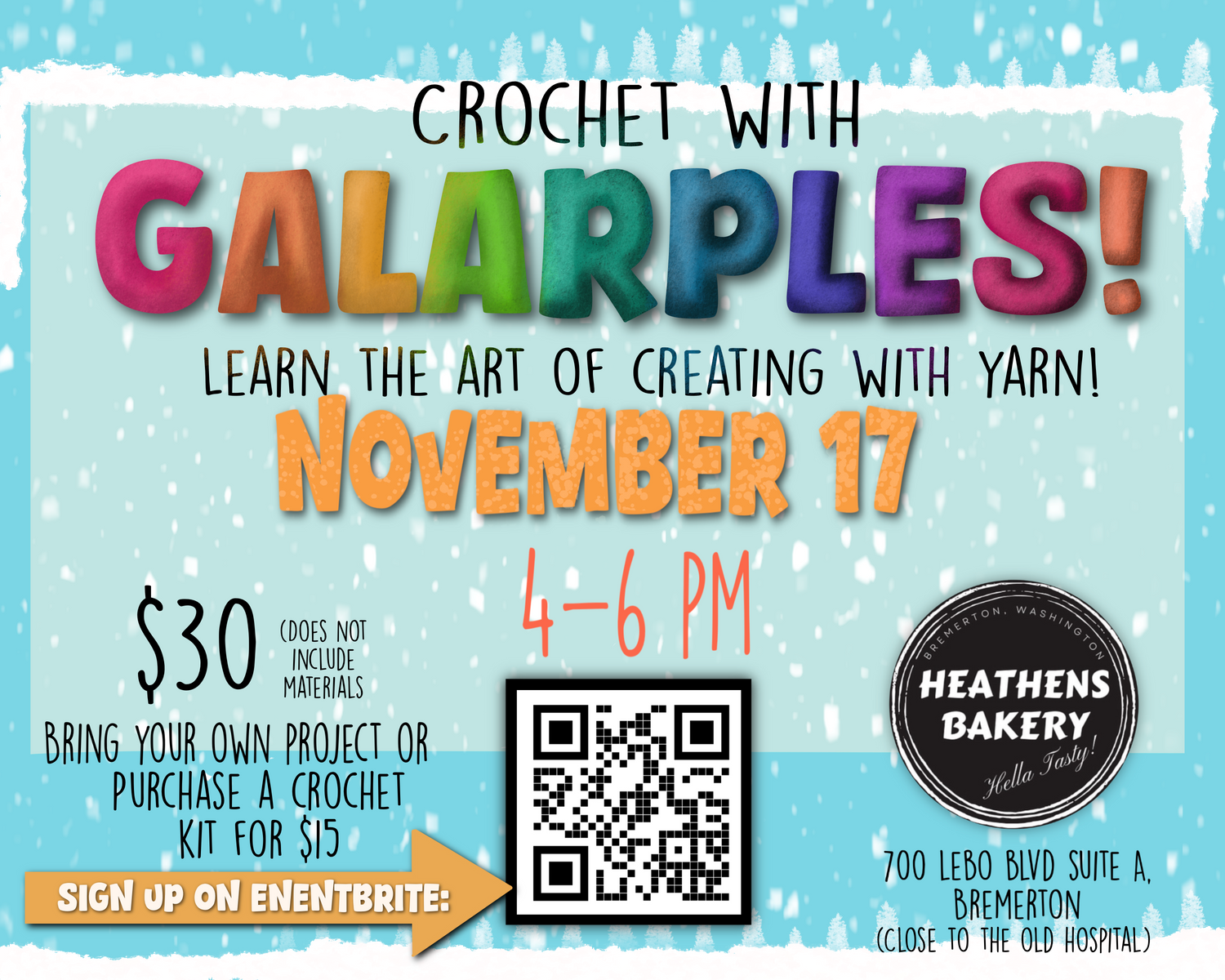 If you live locally and want to learn how to make fun things with yarn, then sign up for my super fun class! Hosted at the amazing Heathens Bakery, the class is small to make sure everyone gets a great chance to learn! Sign ups are on eventbrite!